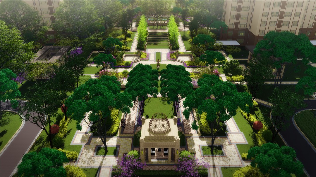 景觀結(jié)構(gòu)采用軸線景觀與自然景觀相結(jié)合的形式,中央藝術(shù)公園軸線對稱,秘密花園然、舒適、閑適、幽靜。